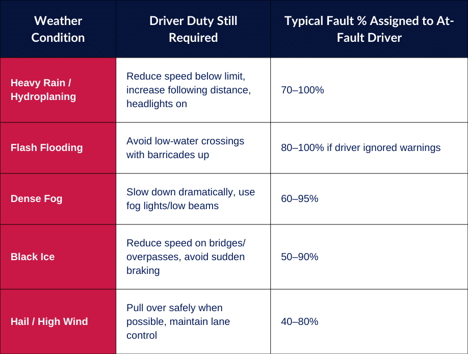 But here’s the part insurance companies love to twist: just because it was raining, sleeting, or foggy doesn’t mean the at-fault driver walks away without responsibility. Texas still follows comparative fault rules. Even in terrible weather, every driver has a duty to slow down, increase following distance, turn on headlights, and drive according to conditions. Fail to do that and you can still be found at fault, even if the pavement was wet.