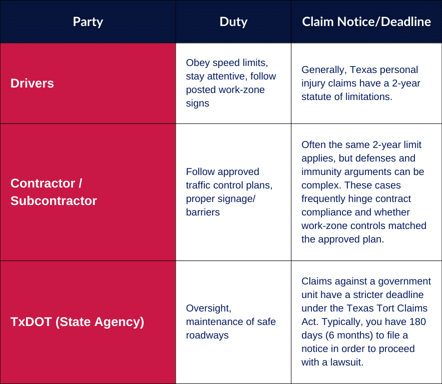 When a crash occurs in a work zone, more than one party could bear responsibility. Below is a practical breakdown of common liable parties, their duties, and typical deadlines under Texas law.